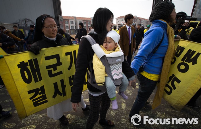 (서귀포=포커스뉴스) 26일 오전 제주 서귀포시 강정마을에서 주민들과 기지 건설을 반대하는 활동가들이 준공식이 열리는 제주 군복합형관광미한(제주해군기지) 정문 앞 부근에서 시위를 하고 있다.