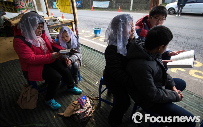 (서귀포=포커스뉴스) 강정마을 주민들이 26일 준공식이 열리는 제주민군복합형관광미항(제주해군기지) 정문 앞 부근에서 기지 건설을 반대하며 기도를 하고 있다.