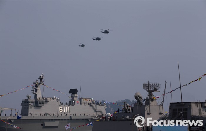 (서귀포=포커스뉴스) 26일 오후 제주 서귀포 제주해군기지에서 열린 '제주민군복합형관광미항' 준공식에서 해군의 링스 대잠헬기가 축하비행을 하고 있다.