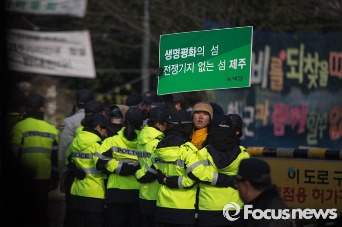 (서귀포=포커스뉴스) 26일 오전 제주 서귀포시 강정마을에서 주민들과 기지 건설을 반대하는 활동가들이 준공식이 열리는 제주 군복합형관광미한(제주해군기지) 정문 앞 부근에서 시위를 하고 있다.