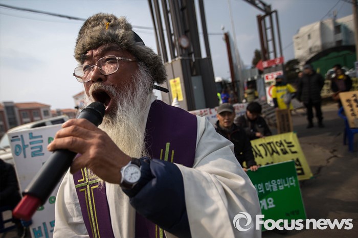 (서귀포=포커스뉴스) 문정현 신부가 26일 준공식이 열리는 제주민군복합형관광미항(제주해군기지) 정문 앞 부근에서 기지 건설을 반대하며 기도를 하고 있다.