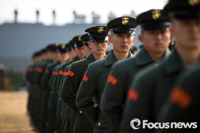 (서귀포=포커스뉴스) 26일 오후 제주 서귀포 제주해군기지에서 열린 '제주민군복합형관광미항' 준공식에 해병대 장병들이 도열해있다.