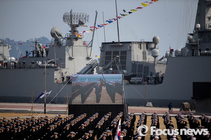 (서귀포=포커스뉴스) 26일 오후 제주 서귀포 제주해군기지에서 열린 '제주민군복합형관광미항' 준공식에서 해군 장병들이 도열해있다.