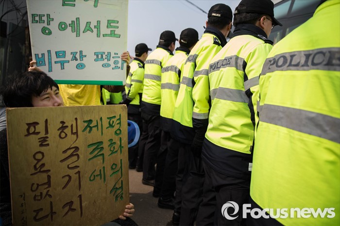 (서귀포=포커스뉴스) 26일 오전 제주 서귀포시 강정마을에서 주민들과 기지 건설을 반대하는 활동가들이 준공식이 열리는 제주 군복합형관광미항(제주해군기지) 정문 앞 부근에서 시위를 하고 있다.