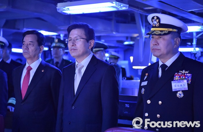 (서울=포커스뉴스) 황교안(가운데) 국무총리가 26일 오후 제주 서귀포 제주해군기지에서 열린 제주민군복합형관광미항 준공식에 참석해 이지스구축함 서애류성룡함을 둘러보고 있다. <사진제공=해군>