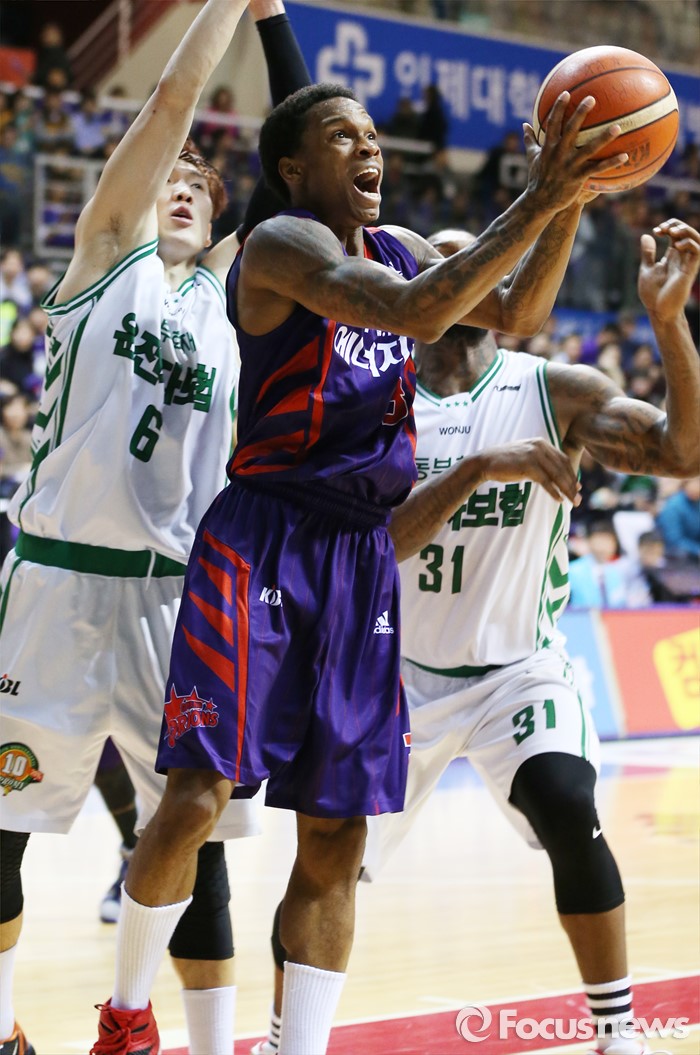 (고양=포커스뉴스) 26일 고양체육관에서 열린 2015-2016 프로농구 오리온-동부 6강 플레이오프 1차전에서 오리온 조 잭슨이 동부 두경민과 맥키네스의 수비를 뚫고 리버스 레이업슛을 시도하고 있다.