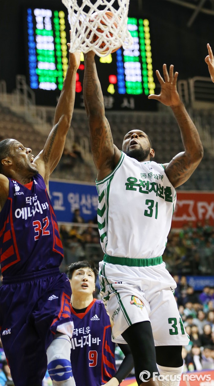 (고양=포커스뉴스) 26일 고양체육관에서 열린 2015-2016 프로농구 오리온-동부 6강 플레이오프 1차전에서 동부 맥키네스가 오리온 애런 헤인즈의 마크를 받으며 레이업슛을 시도하고 있다.