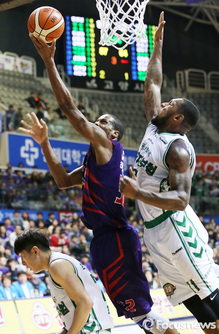 (고양=포커스뉴스) 26일 고양체육관에서 열린 2015-2016 프로농구 오리온-동부 6강 플레이오프 1차전에서 오리온 애런 헤인즈가 동부 맥키네스의 블록을 피해 레이업슛을 시도하고 있다.
