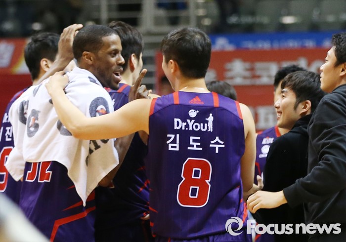 (고양=포커스뉴스) 26일 고양체육관에서 열린 2015-2016 프로농구 오리온-동부 6강 플레이오프 1차전에서 동부를 물리친 후 오리온 김도수가 애런 헤인즈의 어꺠를 감싸안으며 기쁨을 나누고 있다.