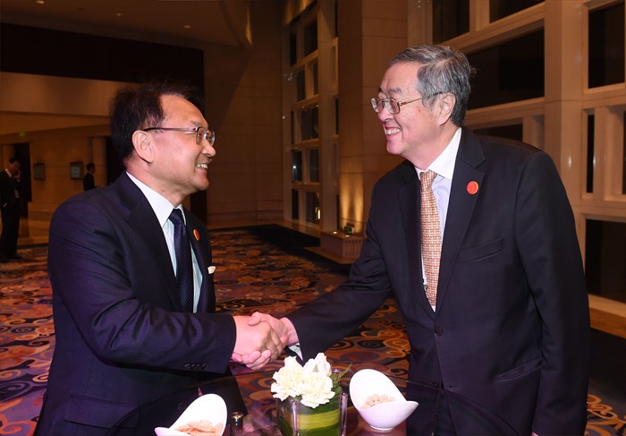 | △ 저우샤오촨 중국 인민은행장과 악수하는 유일호 부총리 |