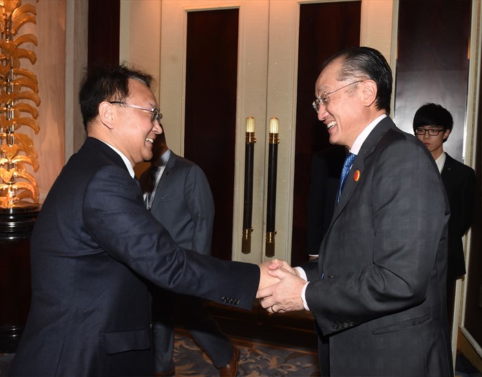 (서울=포커스뉴스) G20재무장관·중앙은행총재회의 참석차 중국 상해를 방문중인 유일호 경제부총리 겸 기획재정부 장관이 26일 오후(현지시간) 푸동 상글리라 호텔에서 김용 세계은행(WB) 총재와 면담에 앞서 악수를 하고 있다. <사진제공=기획재정부>