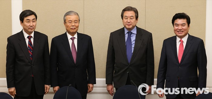 (서울=포커스뉴스) 테러방지법 직권상정에 반발해 야당이 무제한 토론(필리버스터)를 나흘째 진행하고 있는 26일 오후 서울 여의도 국회 귀빈식당에서 선거구 획정 및 쟁점법안 논의를 위한 여야 지도부 회동에 앞서 참석자들이 취재진을 향해 포즈를 취하고 있다. 왼쪽부터 이종걸 더불어민주당 원내대표, 김종인 비대위 대표, 김무성 새누리당 대표, 원유철 원내대표.