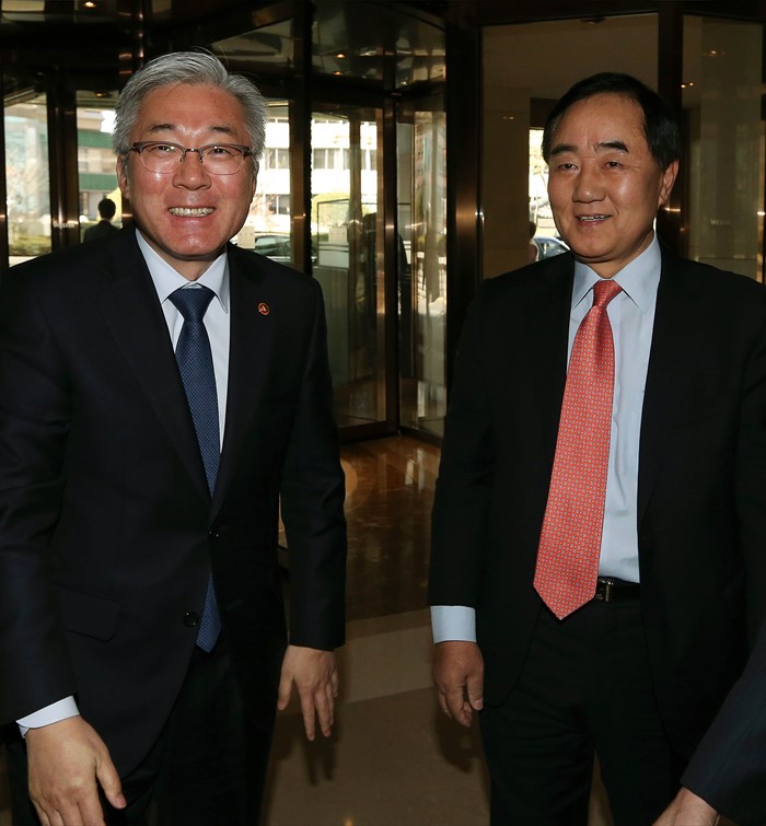 (서울=포커스뉴스) 김종덕(왼쪽) 문화체육관광부 장관이 26일 서울 중구 조선호텔에서 열린 '호텔업계 간담회'에 참석해 유용종 호텔협회장과 함께 입장하고 있다. <사진제공=문화체육관광부>