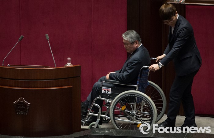 | △ 휠체어에 앉아 쓸쓸히 퇴장하는 김용익 |
