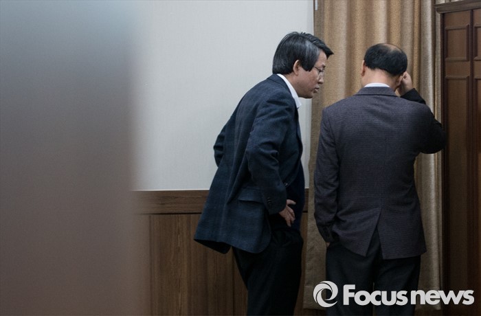 (서울=포커스뉴스) 27일 오후 서울 관악구 중앙선거관리위원회 관악청사에서 선거구획정위 전체회의에 참석한 박영수(뒷모습) 선거구획정위원회 위원장이 회의 시작 전 김동욱 위원과 이야기를 나누고 있다.