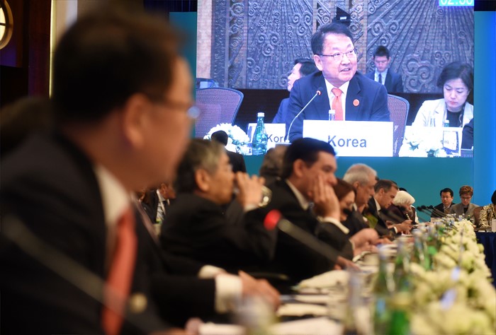 (서울=포커스뉴스) 유일호 부총리 겸 기획재정부 장관이 27일 (현지시간) 중국 상해에서 열린 G20재무장관.중앙은행총재회의 참석, 거시정책공조 세션에서 발언을 하고 있다. <사진제공=기획재정부>