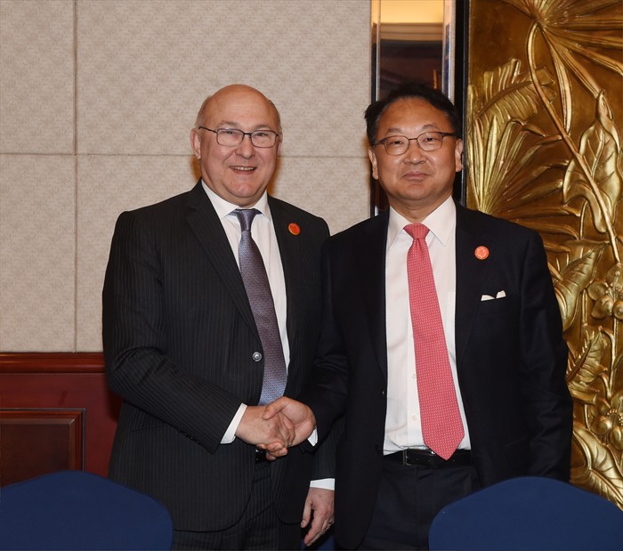 (서울=포커스뉴스) G20재무장관, 중앙은행총재회의 참석차 중국 상해를 방문중인 유일호 부총리 겸 기획재정부 장관이 27일 (현지시간) 푸동 상글리라 호텔에서 미셸 샤팽 프랑스 재무장관과 면담에 앞서 악수를 하고 있다. <사진제공=기획재정부>