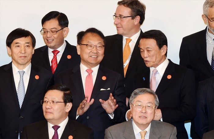 (서울=포커스뉴스) 유일호 부총리 겸 기획재정부 장관이 27일 중국 상해 푸동 상글리라 호텔에서 열린 G20재무장관.중앙은행총재회의 참석, 각국 참석자들과 기념촬영을 하고 있다. <사진제공=기획재정부>