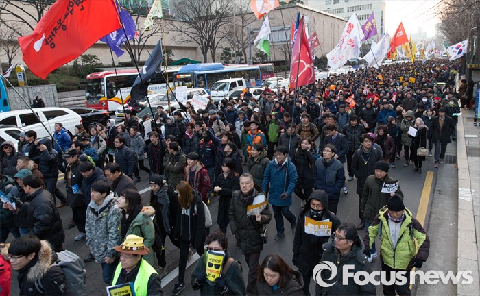 (서울=포커스뉴스) 27일 오후 서울광장에서 민주노총과 참여연대, 전국빈민연합 등 시민사회단체들이 4차 민중총궐기 집회를 마치고 행진하고 있다.