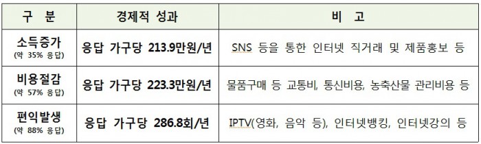 응답 가입자를 바탕으로 분석한 결과, SNS 등을 통한 인터넷 직거래와 제품홍보 등을 통해 설문응답 가구당 소득증가가 연간 213만9000원 이뤄졌으며 제품구매 등의 교통비, 통신비 및 농축산물 관리비 등에 따른 비용절감이 연간 223만3000원,IPTV(인터넷TV)·인터넷 뱅킹·인터넷 강의 이용 등 편익이 연간 286.8회 발생한 것으로 나타났다.