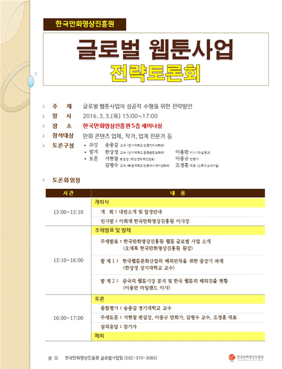 한국만화영상진흥원은 오는 3월3일 오후 3시세미나실에서 '글로벌 웹툰사업 전략토론회'를 개최한다고 28일 밝혔다.