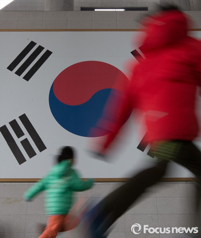 (천안=포커스뉴스) 3.1절을 이틀 앞둔 28일 오후 충남 천안 독립기념관을 찾은 어린이들이 대형 태극기 앞을 뛰어가고 있다.