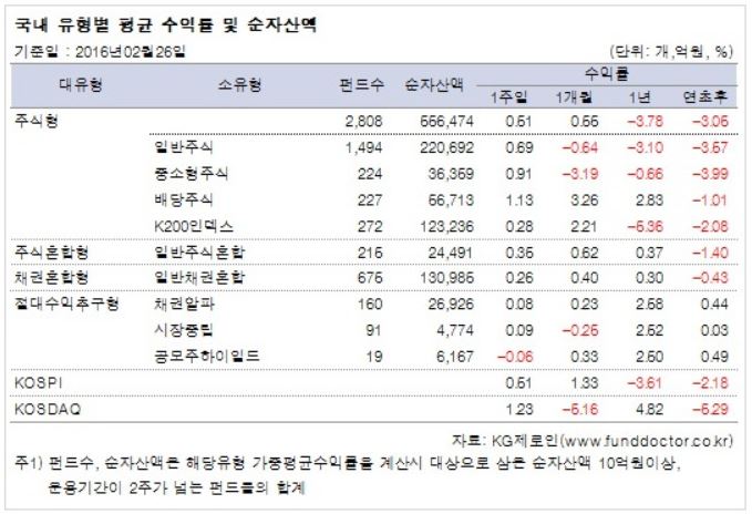 28일 펀드평가사 KG제로인이 지난 26일 공시된 기준 가격으로 펀드 수익률을 조사한 결과, 전체 국내 주식형펀드는 한 주간 0.51% 상승했다.