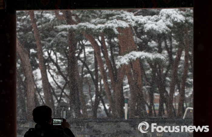 (서울=포커스뉴스) 수도권과 전국 곳곳에에 강한 바람과 함께 기습적인 폭설이 내린 28일 오후 서울 강북구 솔밭공원에서 한 시민이 사진을 찍고 있다.