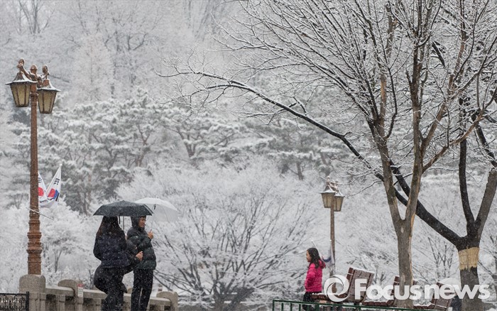 (서울=포커스뉴스) 수도권과 전국 곳곳에에 강한 바람과 함께 기습적인 폭설이 내린 28일 오후 서울 강북구 4.19 민주묘지에서 한 가족이 나들이를 즐기고 있다.