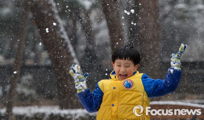 (서울=포커스뉴스) 수도권과 전국 곳곳에에 강한 바람과 함께 기습적인 폭설이 내린 28일 오후 서울 강북구 솔밭공원에서 한 어린이가 즐겁게 뛰어놀고 있다.