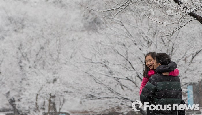 (서울=포커스뉴스) 수도권과 전국 곳곳에에 강한 바람과 함께 기습적인 폭설이 내린 28일 오후 서울 강북구 4.19 민주묘지에서 한 어린이가 아빠 품에 안겨 있다.