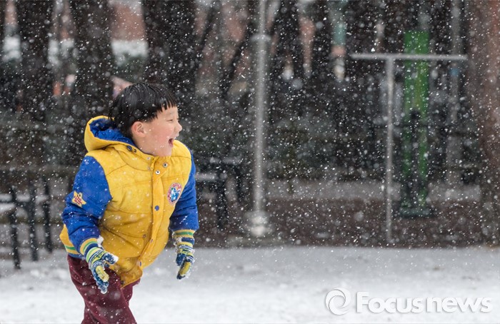 (서울=포커스뉴스) 수도권과 전국 곳곳에에 강한 바람과 함께 기습적인 폭설이 내린 28일 오후 서울 강북구 솔밭공원에서 한 어린이가 즐겁게 뛰어놀고 있다.