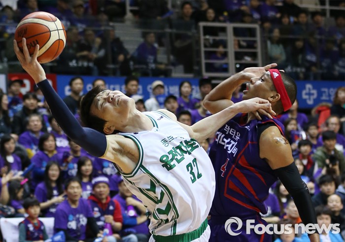 (고양=포커스뉴스) 28일 고양체육관에서 열린 2015-2016 프로농구 오리온-동부 6강 플레이오프 2차전에서 동부 김주성이 리바운드볼을 잡다 오리온 문태종과 충돌하고 있다.