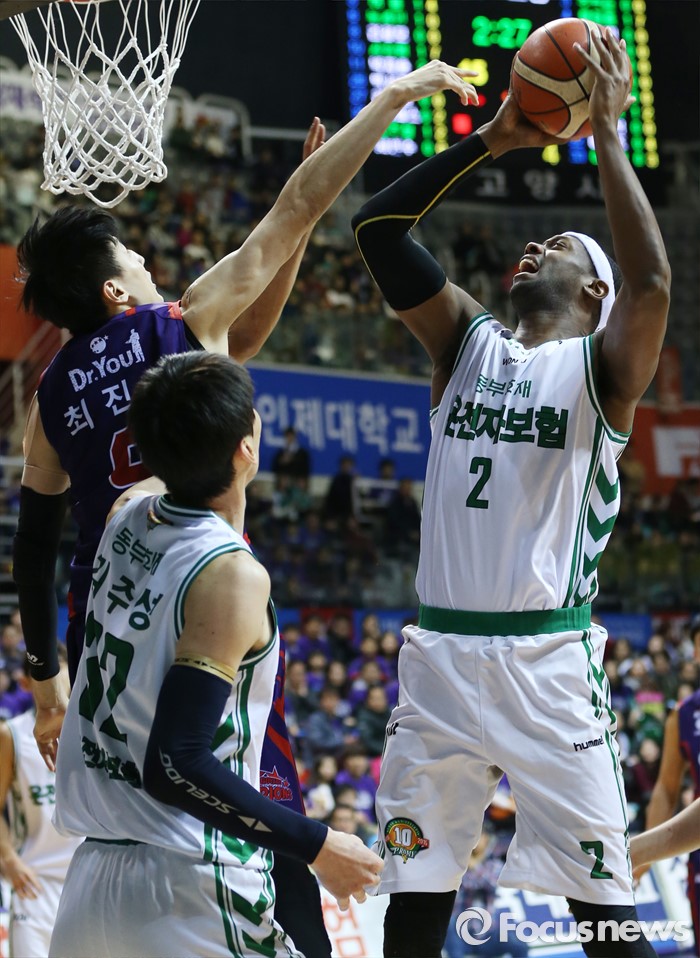 (고양=포커스뉴스) 28일 고양체육관에서 열린 2015-2016 프로농구 오리온-동부 6강 플레이오프 2차전에서 동부 벤슨이 오리온 최진수의 마크를 따돌리며 점프슛을 쏘고 있다.
