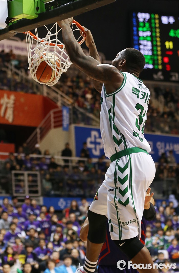 (고양=포커스뉴스) 28일 고양체육관에서 열린 2015-2016 프로농구 오리온-동부 6강 플레이오프 2차전에서 동부 맥키네스가 투핸드 덩크를 림 안에 꽂이넣고 있다.