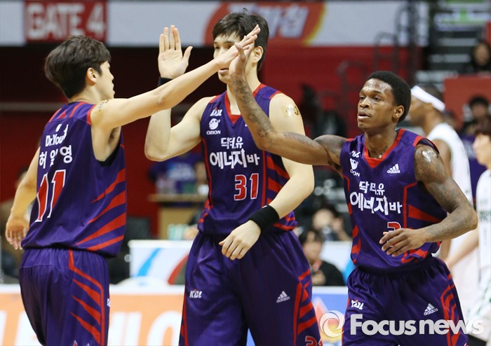 (고양=포커스뉴스) 28일 고양체육관에서 열린 2015-2016 프로농구 오리온-동부 6강 플레이오프 2차전에서 득점에 성공한 오리온 조 잭슨과 허일영이 하이파이브를 하고 있다.
