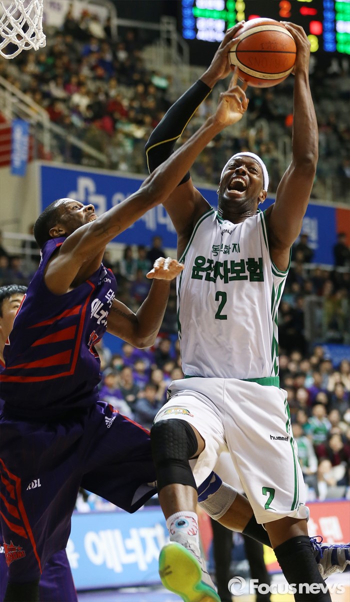 (고양=포커스뉴스) 28일 고양체육관에서 열린 2015-2016 프로농구 오리온-동부 6강 플레이오프 2차전에서 동부 벤슨이 오리온 헤인즈를 제치며 리바운드볼을 잡고 있다.