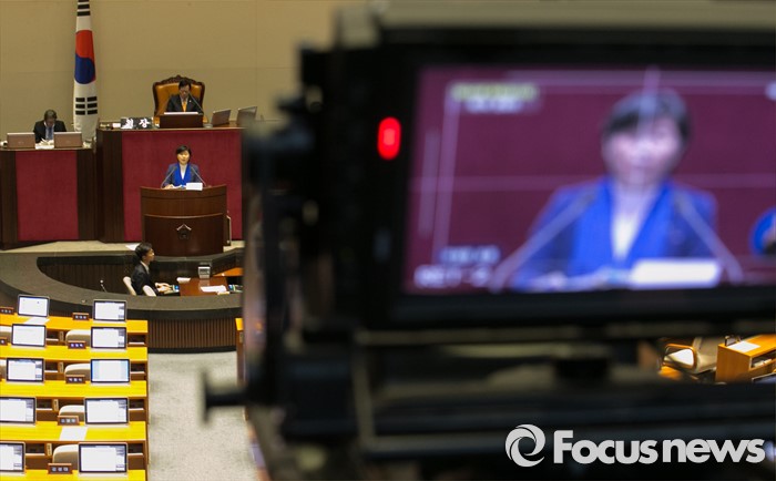 (서울=포커스뉴스) 테러방지법 직권상정에 반발해 야당이 무제한 토론(필리버스터)를 일주일째 진행하며 총 130시간을 돌파한 29일 오전 서울 여의도 국회 본회의장에서 토론에 나선 서영교 더불어민주당 의원이 발언하고 있다.