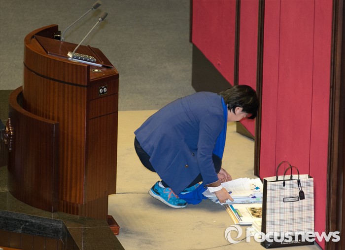 | △ 필리버스터 나선 서영교 의원, '운동화에 신고 자료 준비' |