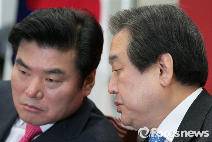 (서울=포커스뉴스) 김무성(오른쪽) 새누리당 대표가 29일 오전 서울 여의도 국회에서 열린 최고위원회의에 참석해 원유철 원내대표와 대화하고 있다.