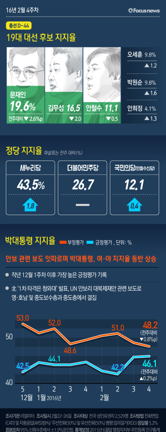 이번 주간집계는 2016년 2월 22일부터 26일까지 5일간 전국 19세 이상 유권자 2,529명을 대상으로 전화면접(CATI) 및 자동응답(ARS) 방식으로 무선전화(60%)와 유선전화(40%) 병행 임의걸기(RDD) 방법으로 조사했고, 응답률은 5.2%이다. 통계보정은 2015년 12월말 행정자치부 주민등록 인구통계 기준 성, 연령, 권역별 가중치 부여 방식으로 이루어졌고, 표집오차는 95% 신뢰수준에서 ±1.9%p이다. 일간집계는 ‘2일 이동 시계열(two-day rolling time-series)’ 방식으로 22일 1,011명, 23일 1,014명, 24일 1,011명, 25일 1,013명, 26일 1,011명을 대상으로 실시했고, 응답률은 22일 5.4%, 23일 5.4%, 24일 5.2%, 25일 5.0%, 26일 5.1%, 표집오차는 5일간 모두 95% 신뢰수준에서 각각 ±3.1%p이다. 일간집계의 통계보정 방식은 주간집계와 동일하다.
