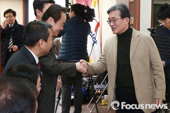 | △ 예비후보들과 인사하는 이한구 위원장 |