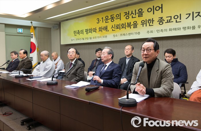 (서울=포커스뉴스) 29일 오후 서울 중구 프레스센터에서 '3.1 운동의 정신을 이어 민족의 평화와 화해, 신뢰회복을 위한 종교인 기자회견'에 참석한 개신교 박종화(오른쪽) 목사가 인사말을 하고 있다.