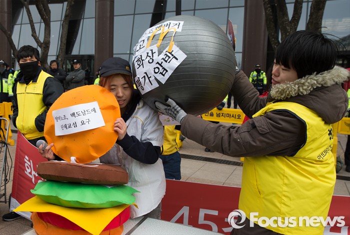 (서울=포커스뉴스) 29일 오전 서울 종로구 한국맥도날드본사 앞에서 알바노조 조합원들이 '45초 햄버거, 17분 30초 배달제 폐지' 등 10대 안건을 들고 단체교섭을 요구하는 퍼포먼스를 하고 있다.