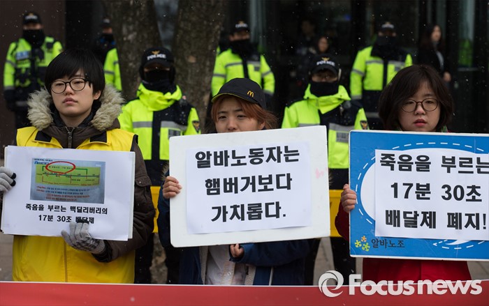 (서울=포커스뉴스) 29일 오전 서울 종로구 한국맥도날드본사 앞에서 알바노조 조합원들이 '45초 햄버거, 17분 30초 배달제 폐지' 등 10대 안건을 들고 단체교섭을 요구하는 기자회견을 하고 있다.
