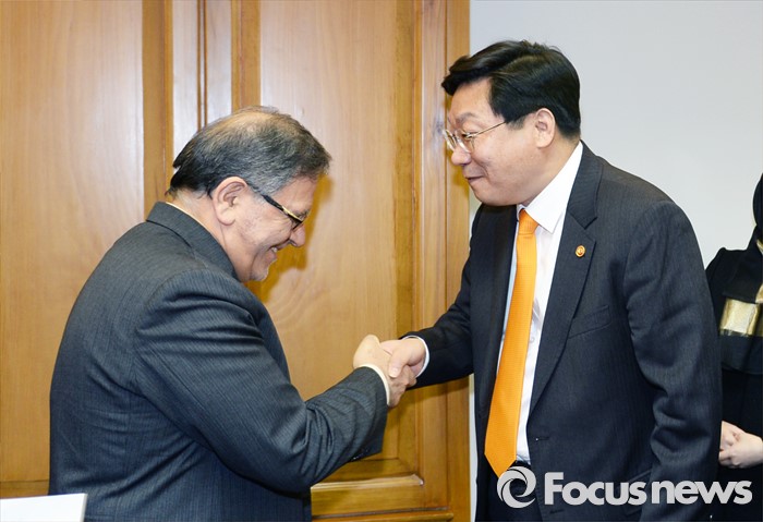 (서울=포커스뉴스) 주형환 산업통상자원부 장관은 28일(현지시간) 이란 중앙은행에서 발리올라 세이프(Valiollah SEIF) 이란 중앙은행 총재와 면담에 앞서 악수를 하고 있다. <사진제공=산업통상자원부>