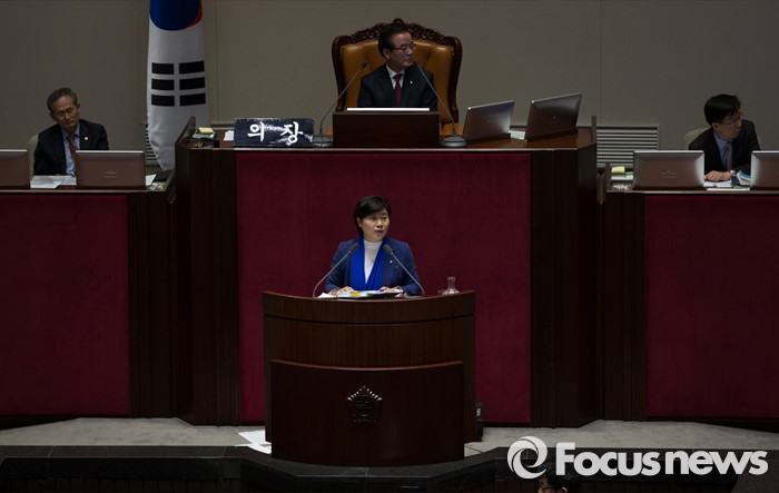 (서울=포커스뉴스) 테러방지법 직권상정에 반발해 야당이 무제한 토론(필리버스터)를 일주일째 진행하며 총 135시간을 돌파한 29일 오후, 서영교 더불어민주당 의원이 서울 여의도 국회 본회의장에서 토론을 하고 있다.