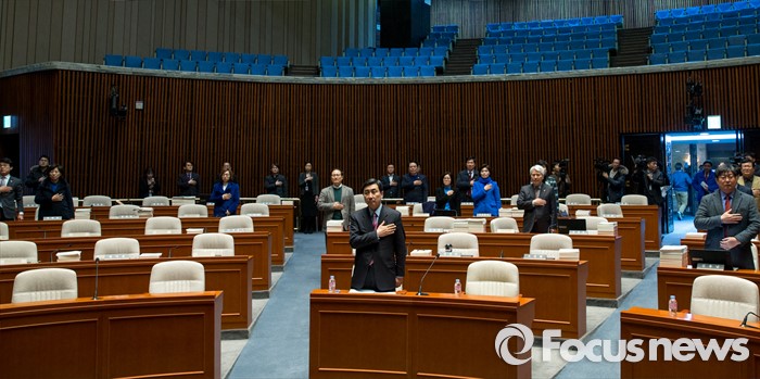 (서울=포커스뉴스) 이종걸 더불어민주당 원내대표를 비롯한 의원들이 29일 오후 서울 영등포구 국회에서 열린 의원총회에 자리해 국민의례 하고 있다.