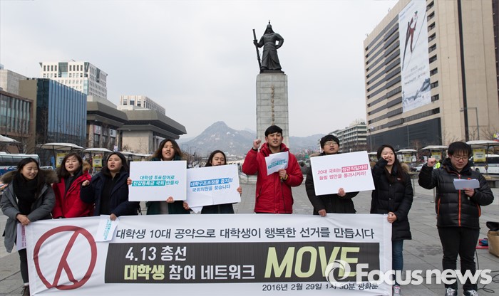 (서울=포커스뉴스) 29일 오후 서울 광화문광장에서 21세기 한국대학생연합 회원들이 '4.13총선 대학생참여 네트워크 무브(Move)' 발족 기자회견을 하고 있다.