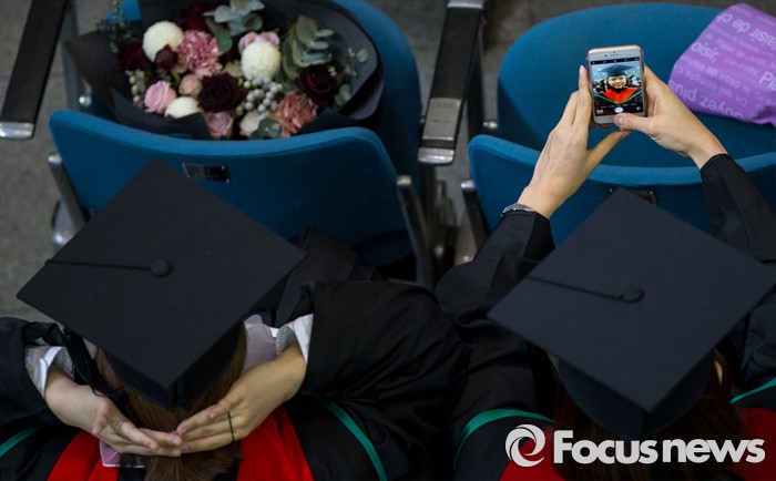 (서울=포커스뉴스) 29일 오후 서울 서대문구 이화여자대학교에서 열린 2015학년도 전기 학위수여식에 참석한 졸업생들이 셀카를 찍고 있다.